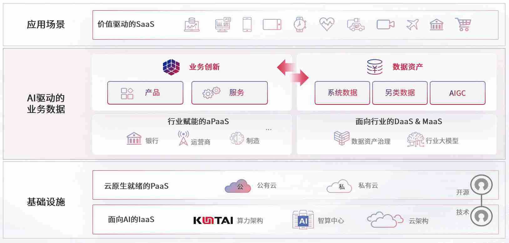 数字时代,,,围绕企业数字化转型的关键要素,,开元ky888数码开创性的提出数云融合战略和技术体系框架,,,着力在云原生、、、、数字原生、、AI原生和信创产业上架构产品和服务能力,,,为处在不同数字化转型阶段的快消零售、、、汽车、、、、金融、、、医疗、、政企、、、、教育、、、、运营商等行业客户提供泛在的敏捷IT能力和融合的数据驱动能力,,构建跨界融合创新的数字业务场景和新业务模式,,助力企业级客户建立面向未来的核心能力和竞争优势,,,全面推动社会的数字化、、、智能化转型升级。。。
