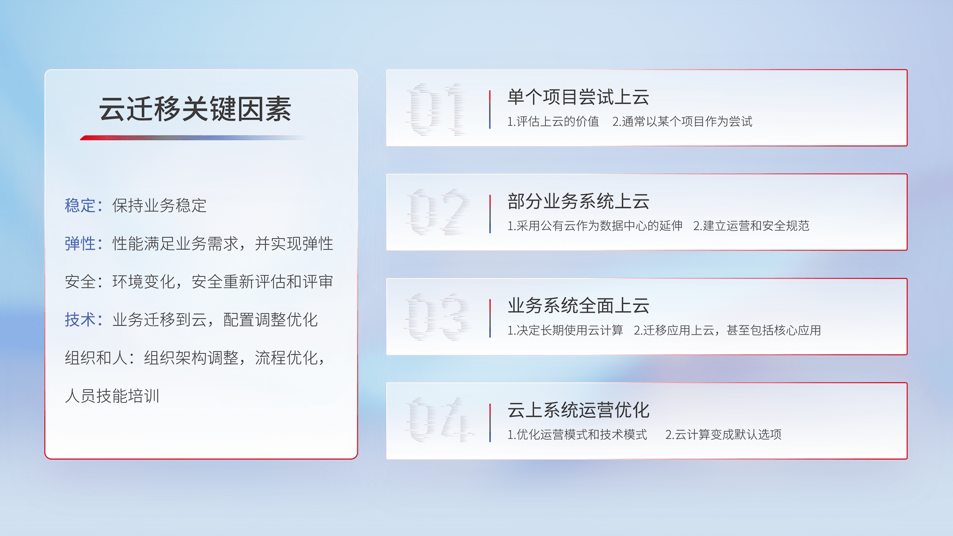 结合实际业务,,从规划设计、、云平台选型、、、、云原生改造、、、数据迁移、、、集成交付,,,,迁移全过程为客户识别最佳上云路径,,,做好风险识别管理,,,,设计网络架构、、、、身份权限、、、安全审计合规、、、操作审计、、日志审计、、监控告警策略、、、、多站点容灾设计等,,对云上基础设施进行整体规划,,提升IT治理水平,,以满足弹性、、高可用、、、高性能的需求。。。。