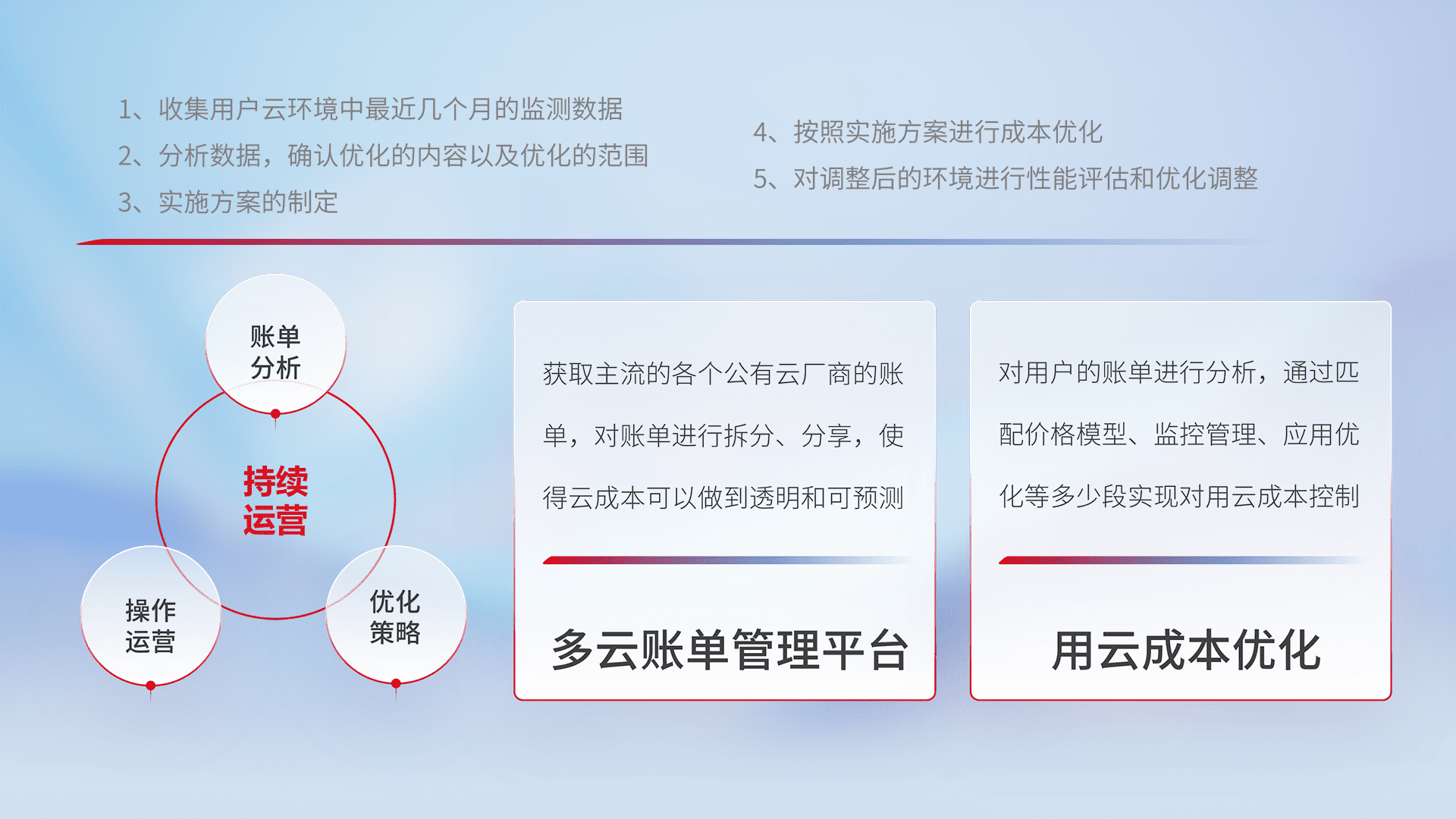 通过多云纳管,,以统一的资源数据模型把客户的云资源进行抽象和封装,,,进而实现对多云资源的统一操作,,,保障云资源管理的可靠性、、、稳定性与可用性。。。量身定制化运维内容,,,,配置、、、、开发运维、、、、补丁管理、、备份、、、监控、、、、认证和访问管理、、审计和日常巡检等,,保障在用云过程中的可靠度,,,,稳定度以及高可用率。。。。