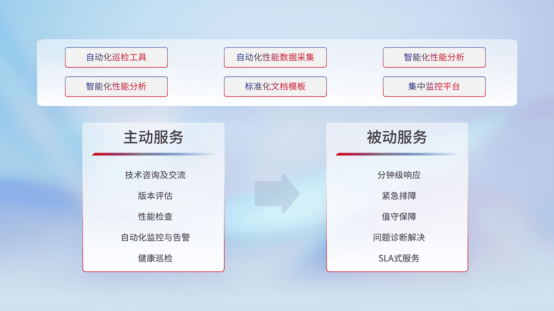 智能化工具和标准化文档,,,保障服务质量,,,,提供主动服务(包含技术咨询、、版本评估、、、、性能检查、、、自动化监控与告警、、、、健康巡检)和被动服务包含(分钟级响应、、、紧急排障、、值守保障、、问题诊断解决、、、SLA服务)。。。